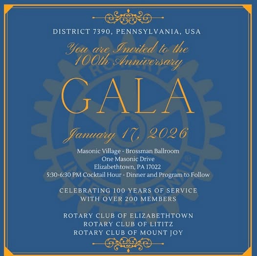 Tickets are officially on sale for the 100th Anniversary Gala — a once-in-a-century celebration hosted by the Rotary Clubs of Elizabethtown, Lititz, and Mount Joy!
